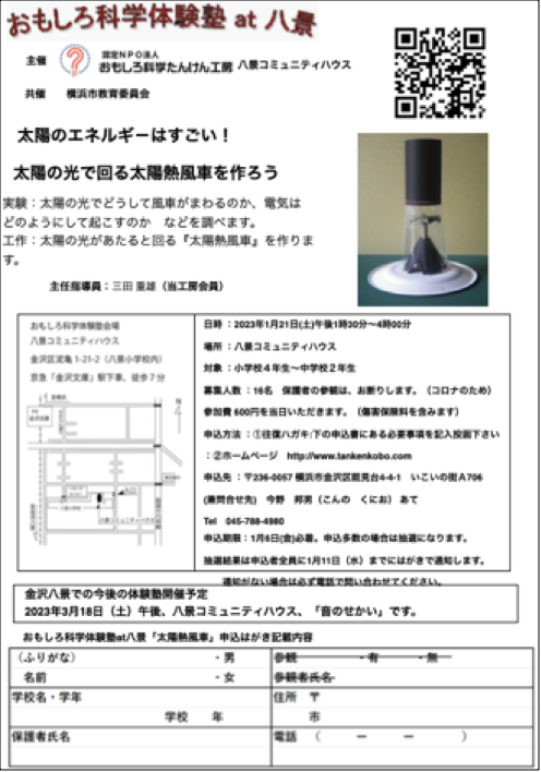 12〜24人くらいの子どもたちに来てもらって毎月、土曜日の午後に体験塾をやっています。これ以外に小学校や地域のコミュニティハウスなどの施設に呼ばれて請負でやるケースもあります。内容的には体験塾とほぼ同じですが、「出前塾」と呼んでいます。地域の出前塾は、子どもたちが休みの夏季休暇や5月の連休などに実施することが多いです。地区センターのお祭りなどのイベントで、5分くらいで出来る簡単な工作を教えることもあります。