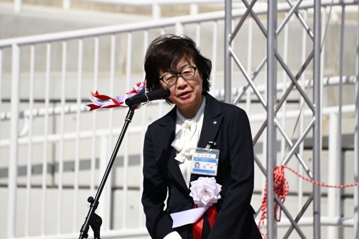 午後2時からセレモニーが開始され、永井京子金沢区長から「金沢水際線緑地」の供用開始にあたり「前は広い海、金沢区らしい景色が見られ、新しい名所になるでしょう」とご挨拶がありました。来賓者のご紹介がされた後、横浜市立並木第四小学校の児童と永井金沢区長、中野港湾局長、来賓者によるくす玉割りが行われました。