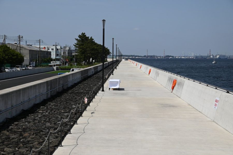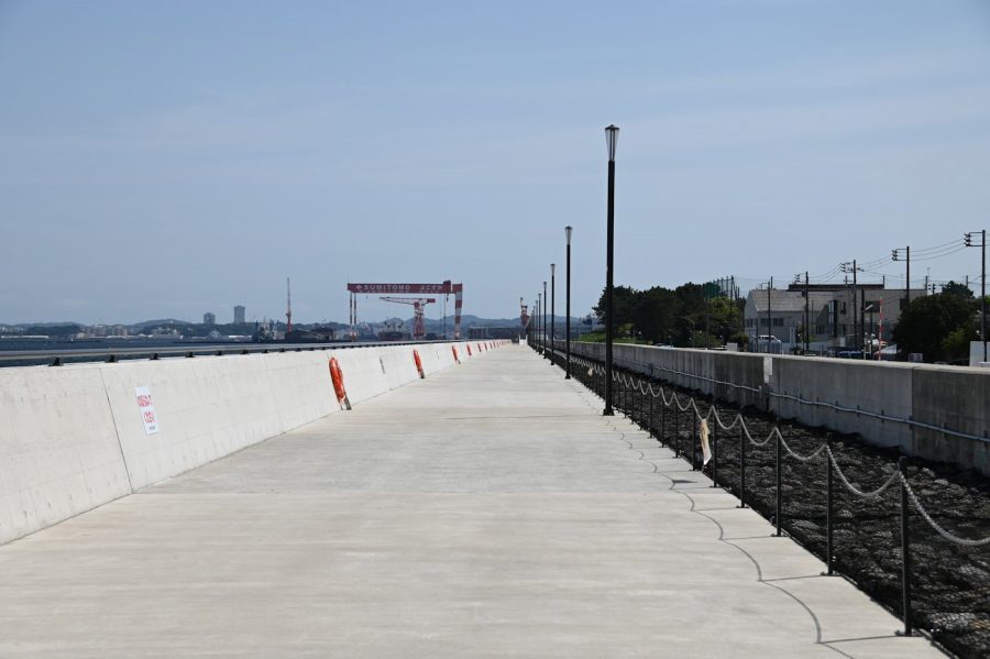今回供用開始前に金沢区民ライターとして取材させてもらえることになり、まだ誰もいない遊歩道に上がることができました。遊歩道は昨年の取材時に聞いていた通リ、間詰石の敷かれている部分は約2.5m。ここは護岸を超えてきた波の排水部分となるため、利用者が立ち入らないようチェーン柵が設置されていました。遊歩道部分は幅が約5mで長さは管理棟から南に約560m、北には約370mあります。
