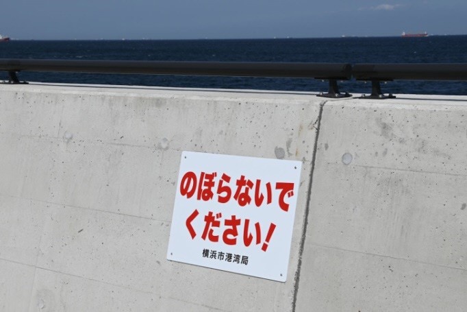 護岸上部の遊歩道には多くの注意喚起と安全対策が実施されていました。海側のパラペット上部には手すりが取り付けられ、万が一の備えに救命浮き輪が等間隔に設置されていました。また、遊歩道を快適に利用していただくため、イラストを用いたマナー啓発看板や、目立つように大きく表示した注意看板等が設置されています。
