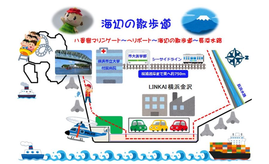 八景島マリンゲートから長浜水路口までのびる約3kmの遊歩道は、「海辺の散歩道」としても区民に親しまれていました。護岸復旧工事により「海辺の散歩道」は現在利用できませんが、今後の計画を担当する大山さん、谷さんから伺った内容を紹介していきます。