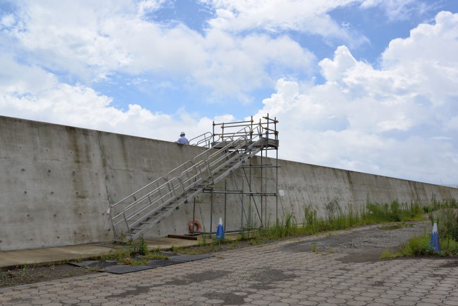 取材時は仮設の階段で福浦護岸に上りました。直立消波ブロック(図参照)の遊歩道についても説明をいただきました。「直立消波ブロック上で遊歩道が計画されている部分は幅が約5mです。間詰石の敷かれている部分は約2.5mありますが、ここは護岸を超えてきた波の排水部分となるため、利用者が立ち入らないようチェーン柵を設置します。駐車場から遊歩道のアクセスは階段とスロープで、中央、両端の3か所を考えています。直立消波ブロックは漁礁の効果もあるので、魚釣り場としても期待できます。海面から護岸の高さは干潮時で7.5m、満潮時で5.5mになります。海釣りを楽しんでいただくことはできますが、遊歩道としての利用もあるため、投げ釣りは危険なので禁止とさせていただきます。安全対策として、海側のパラペット上部に手すりや救命用の浮き輪等を設置します」(谷さん)